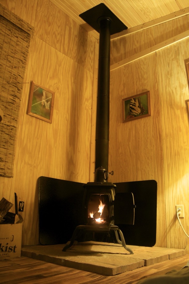 Now that it has gotten colder I’ve started to use the wood burning stove a bit. My general rule of thumb is to only use it when I must which means nights at or below 40 followed by days with a high of 55 or less. If I can I’d rather not use it and just bundle up with extra layers thus saving the wood for another day and minimizing my carbon output. But, on the days that I do use it I have to say that it is a real pleasure! There’s nothing like the blended smell of a wood burning stove and coffee or fried potatoes or home made bread. In such a small space (my cabin is 192 square feet) the aroma of cooking food blends perfectly with that of burning wood. There is also the great benefit of having a warm surface to warm up left over food or coffee without using the propane.