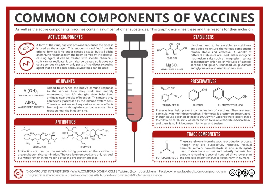From the excellent Compound Interest, a website all about Chemistry, is this post regarding the common components of vaccines.