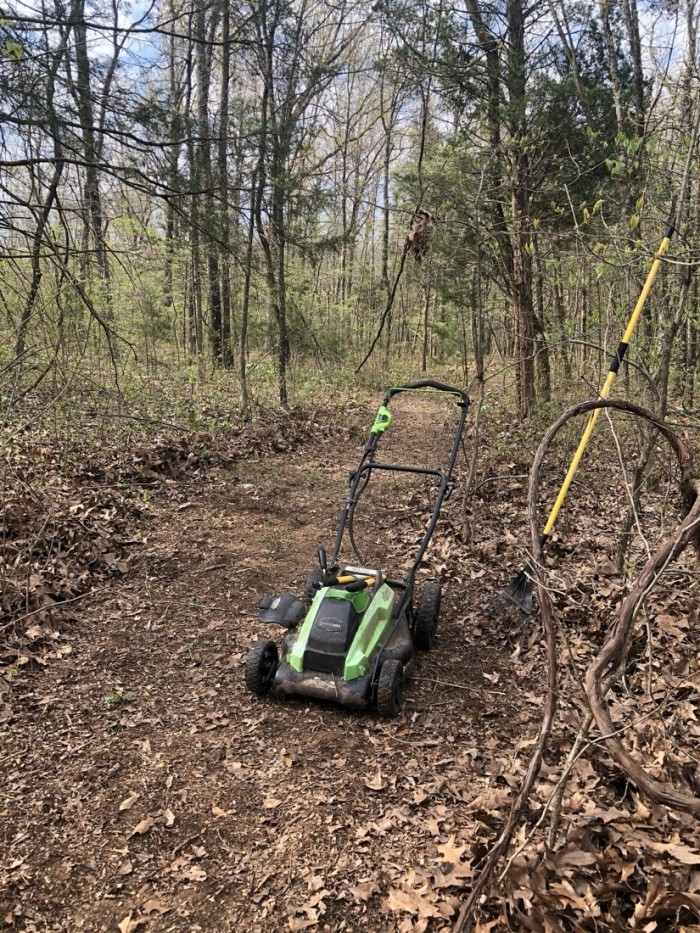 A bit about the path/trail building process. I try to take a minimal approach with the intent of minimal impact. I use a rake, limb clippers and my mower. I’ve got a general route planned and primarily let the land guide me based on the density of growth. I move forward based on tree/brush density choose it the path based on least growth. Common sense probably, just looking for the easiest path forward. I rake some of the leaves and fallen branches then use the clippers to remove branches that reach over the path and small trees in the path. Then run the mower. Repeat. It’s great exercise. I’m averaging about 4 to 5 hours a day working on them trail and the result is already rideable.