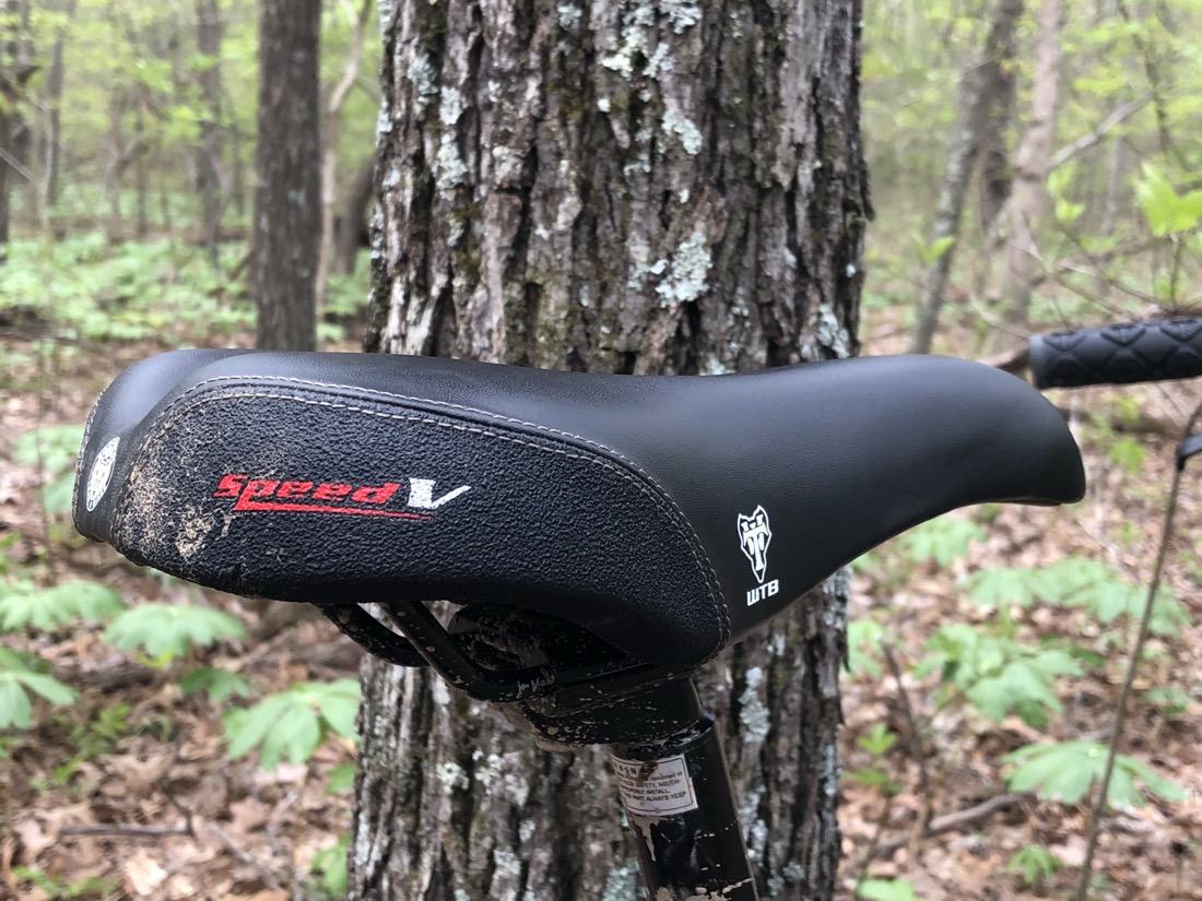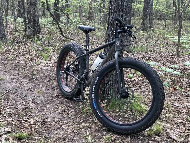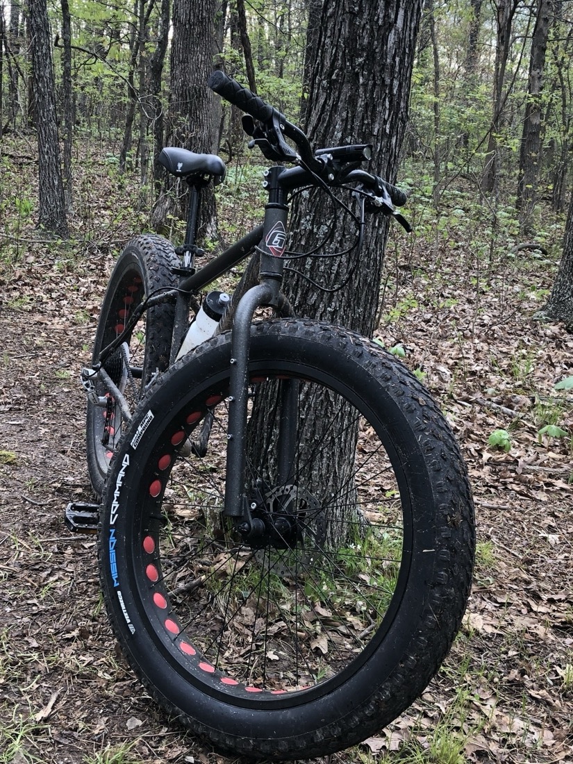 The Mission Command tires by Vee seem to be designed for average conditions which is to say, a bit of everything but nothing too extreme. They’re not reported to be the best tires for snow, I’m not sure about sand. On pavement they have a good bit of self-steer at the current tire pressure of 15psi. I suspect that if I needed to do a lot of road riding I could pump them up to 30psi and much of that self-steer would go away. They do fairly well on gravel and off road which are what I will primarily be using the bike for. Thus far, they are fine on my trails which consist of hard pack, semi-loose dirt and mud. I’ve been riding through some pretty rough terrain on my new trails which still include a few thorns, branches, small, pokey tree stubs, etc. No punctures yet!