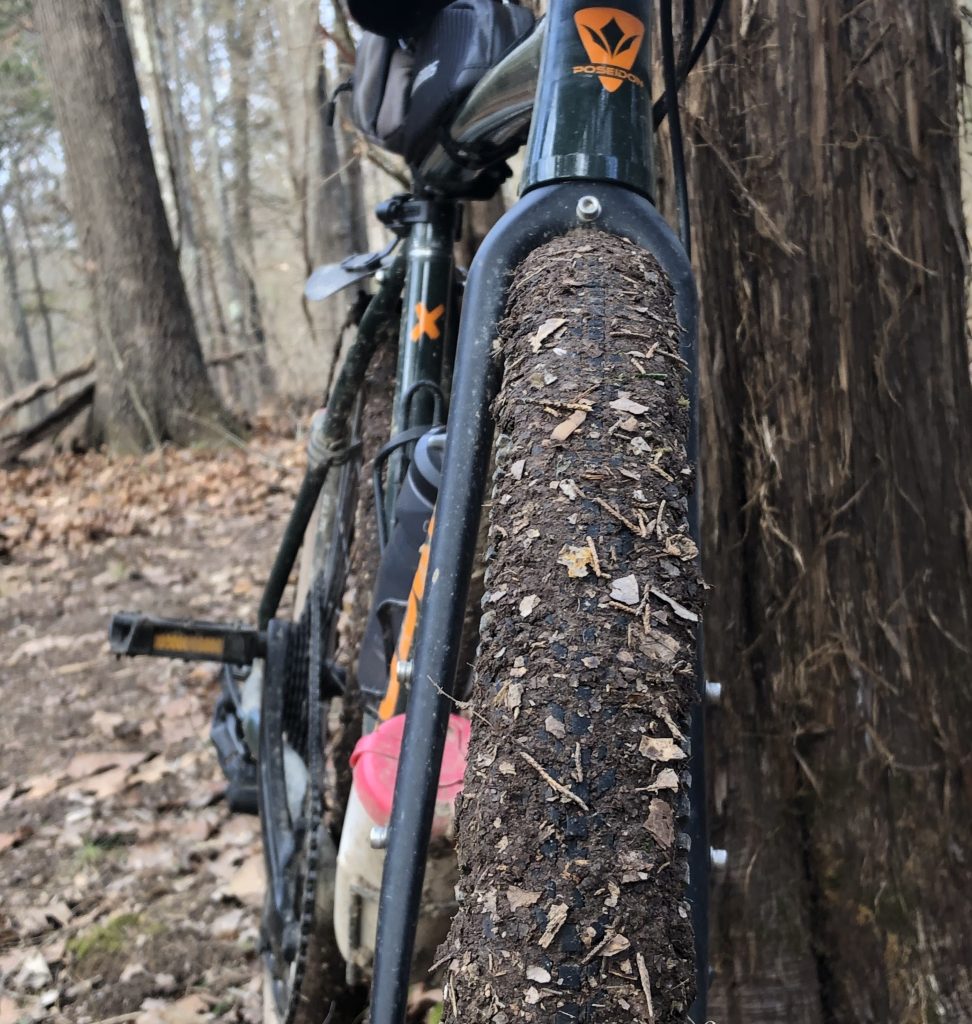 The Touaregs, 47c tires, have been excellent on the 650B wheels. Smooth rolling on pavement thanks to the tiny, closely spaced knobs that make up the center tread but grippy enough on gravel that I’ve never felt out of control. Now, to be honest, I tend to be a slow, conservative rider. Not sure how either of these tires would do for more aggressive riding on gravel. In recent days I’ve been doing all my riding close to home which means a mix of trails, gravel and road. My 8 mile loop is about 4 miles trail, 2 miles gravel, and 2 miles of pavement. I’ve been using the Poseidon for much of this riding and while the Touaregs do great on the dry dirt they do slip a bit when it gets wet and they get really squirmy when it get really muddy. There’s just not a lot of tread for the thicker, stickier mud and so they clog up. That said, they tend to shed that mud pretty quickly once ridden on the gravel.