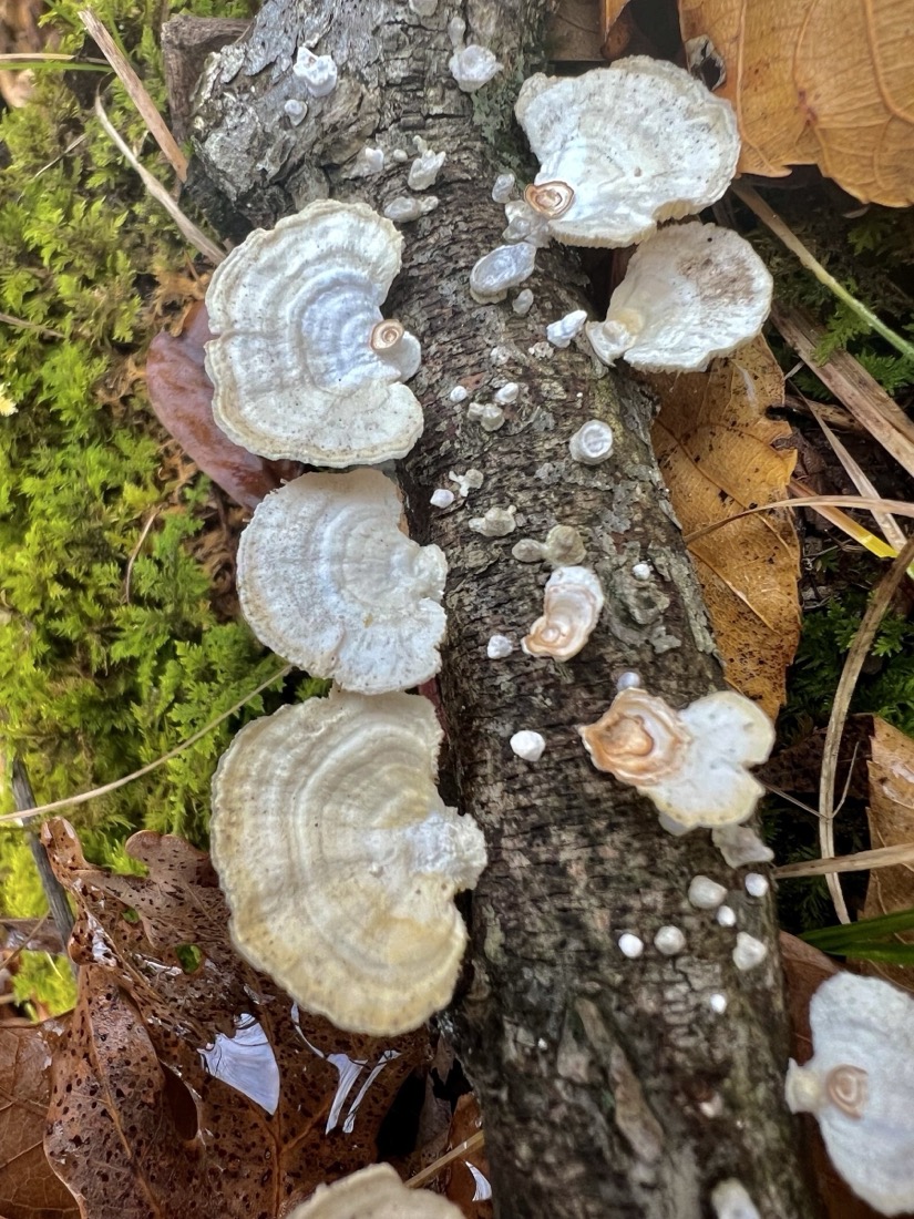 From my morning walk. I almost missed this branch hosting Trametes fungi.