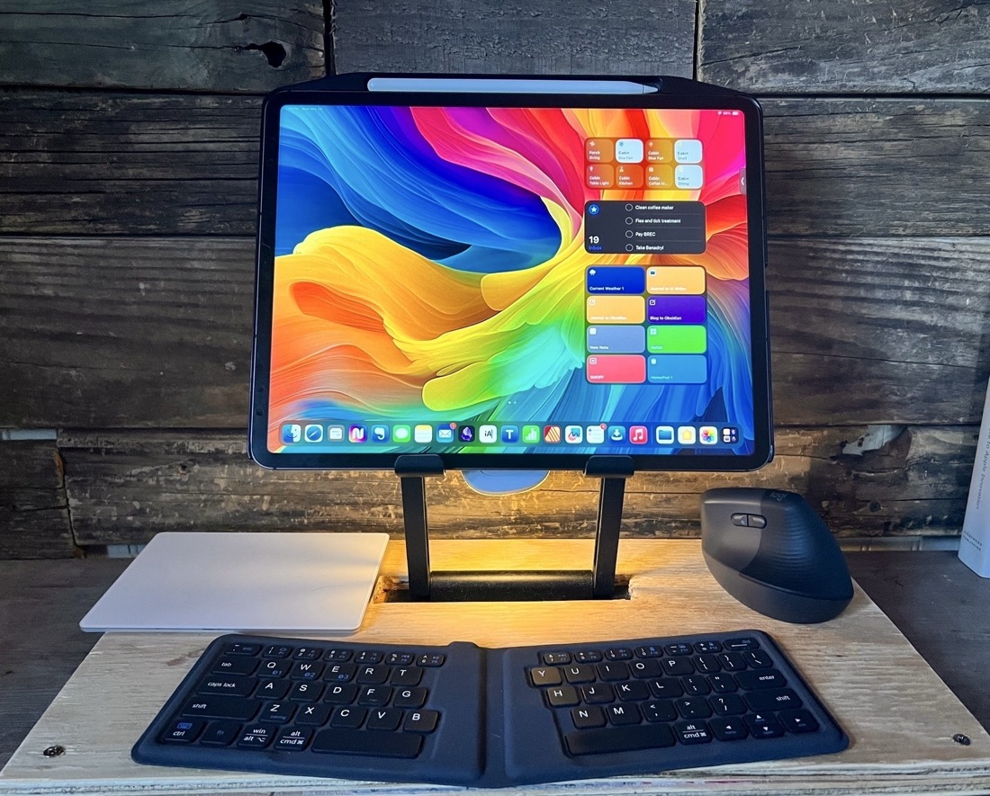 At its core a set-up that raises the iPad/screen to eye level, semi-portable, stable, and a place to store/use a swap-able keyboard.