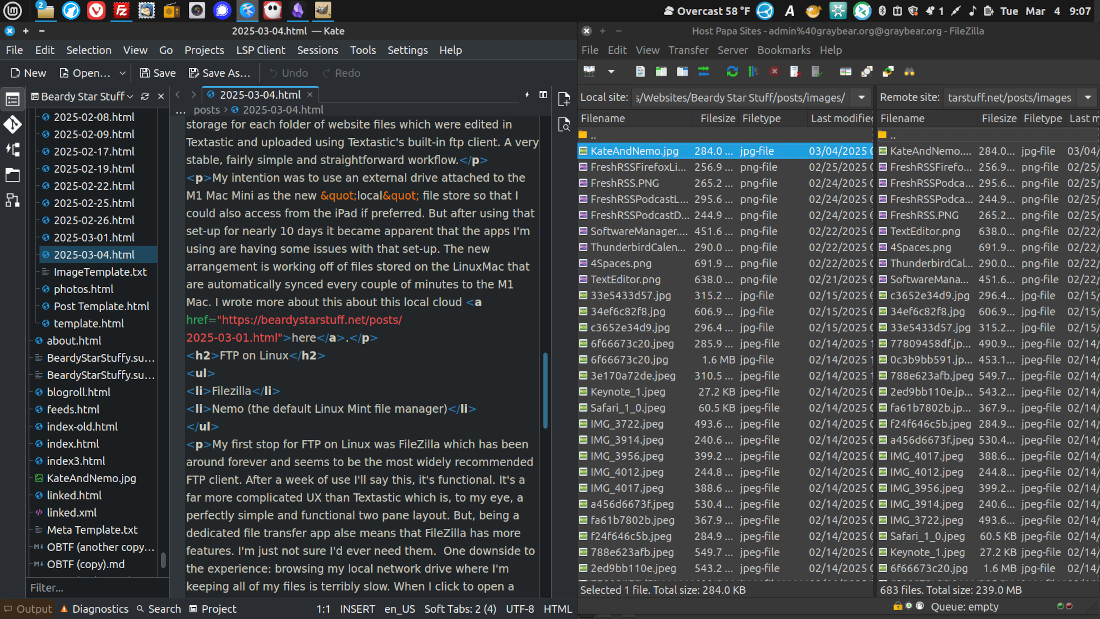 That said, there IS a solution for better file transfer using network drives for "local" file storage: Nemo, the default Files app included with Linux Mint has FTP built in. It does NOT allow for key-based login which I need for one site so I'll still need FileZilla for that site. But for all of my other sites it's fast and solid and thanks to the built in window tiling, it's easy to arrange two quarter windows on the right side of the screen alongside of a half screen text editor. Now that I've switched to local files I coud just settle on Filezilla for everything, I'll experiment a bit.