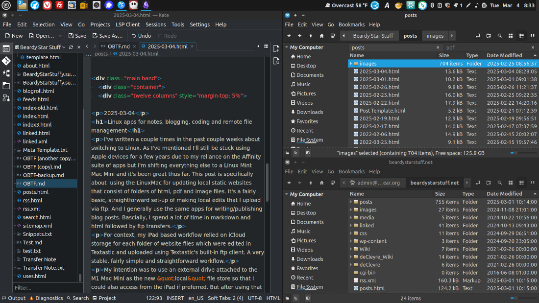 I've written a couple times in the past couple weeks about switching to Linux. As I've mentioned I'll still be stuck using Apple devices for a few years due to my reliance on the Affinity suite of apps but I'm shifting everything else to a Linux Mint Mac Mini and it's been great thus far. This post is specifically about using the LinuxMac for updating local static websites that consist of folders of html, pdf and image files. It's a fairly basic, straightforward set-up of making local edits that I upload via ftp. And I generally use the same apps for writing/publishing blog posts. Bascially, I spend a lot of time in markdown and html followed by ftp transfers.