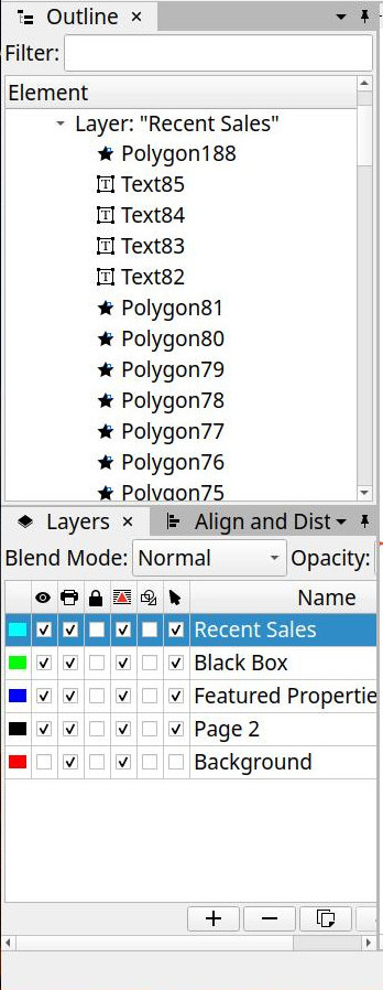 This is similar to what one might do in Apple's Pages app or other similar apps. Add a new polygon, say, a square with a gradient and that's an element. A text box is another. In any document with many elements it's going to get out of hand very quickly especially on a smaller screen like the 15" I'm using. I'm sure 27" display would make it a bit easier but it still seems a bit clumsy. All of these elements are viewable in the Outline Panel but it's still just a long list of elements in the document.
